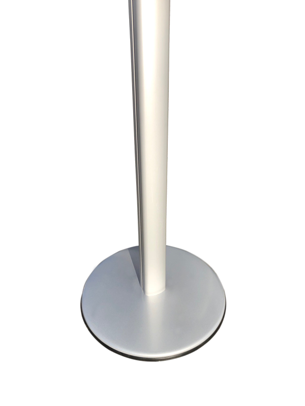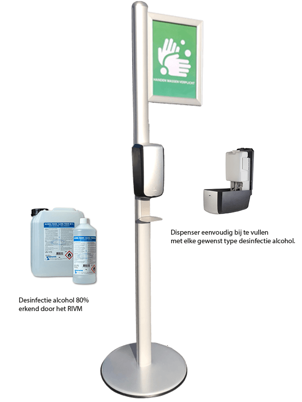 Een prachtige desinfectiepaal met Automatische NO Touch dispenser SPRAY. Een zeer stevige en zware kwaliteit en staat zeer stabiel door de verzwaarde voet. Hoogte is 185cm. In de A3 kliklijst kunt u zelf uw tekst of afbeelding plaatsen.